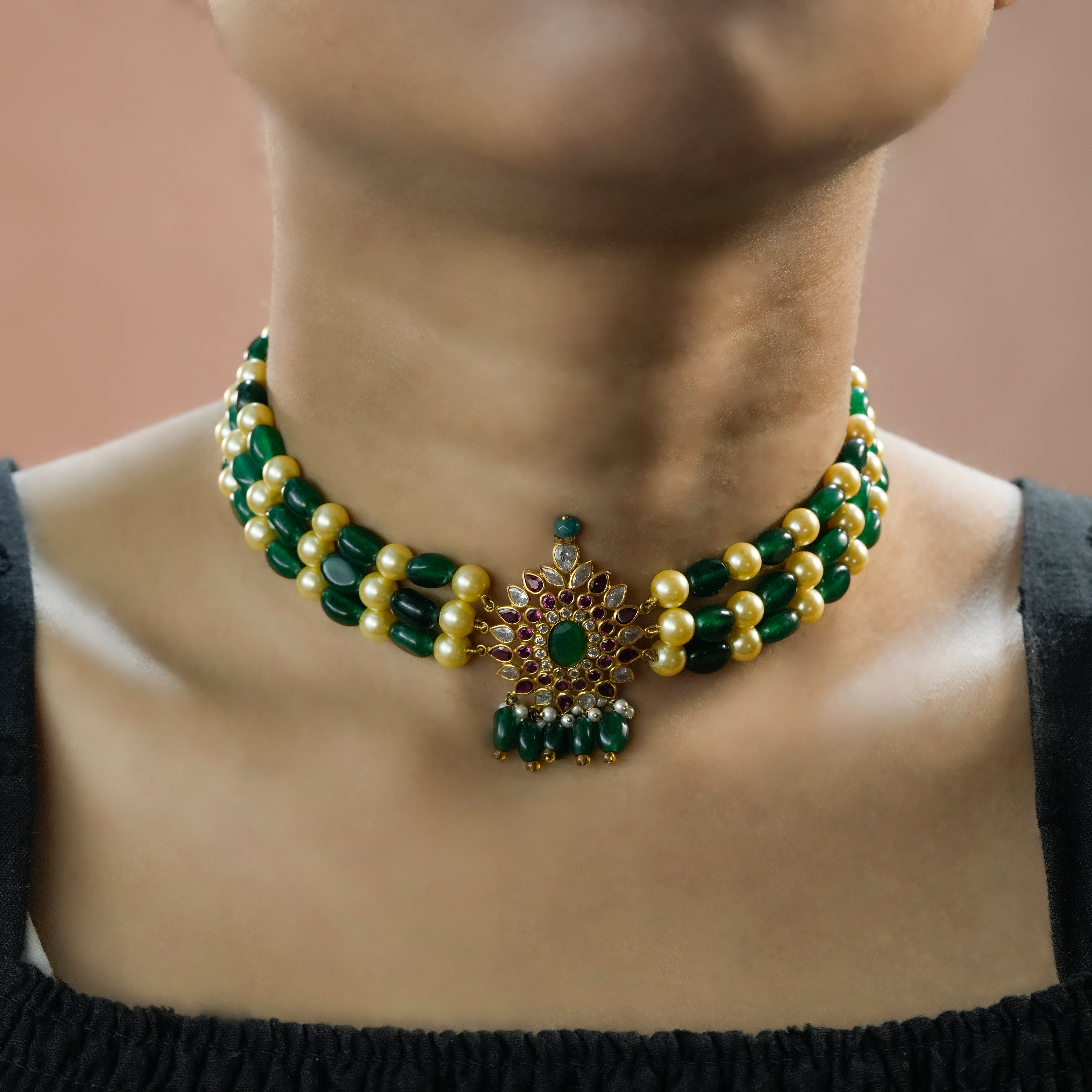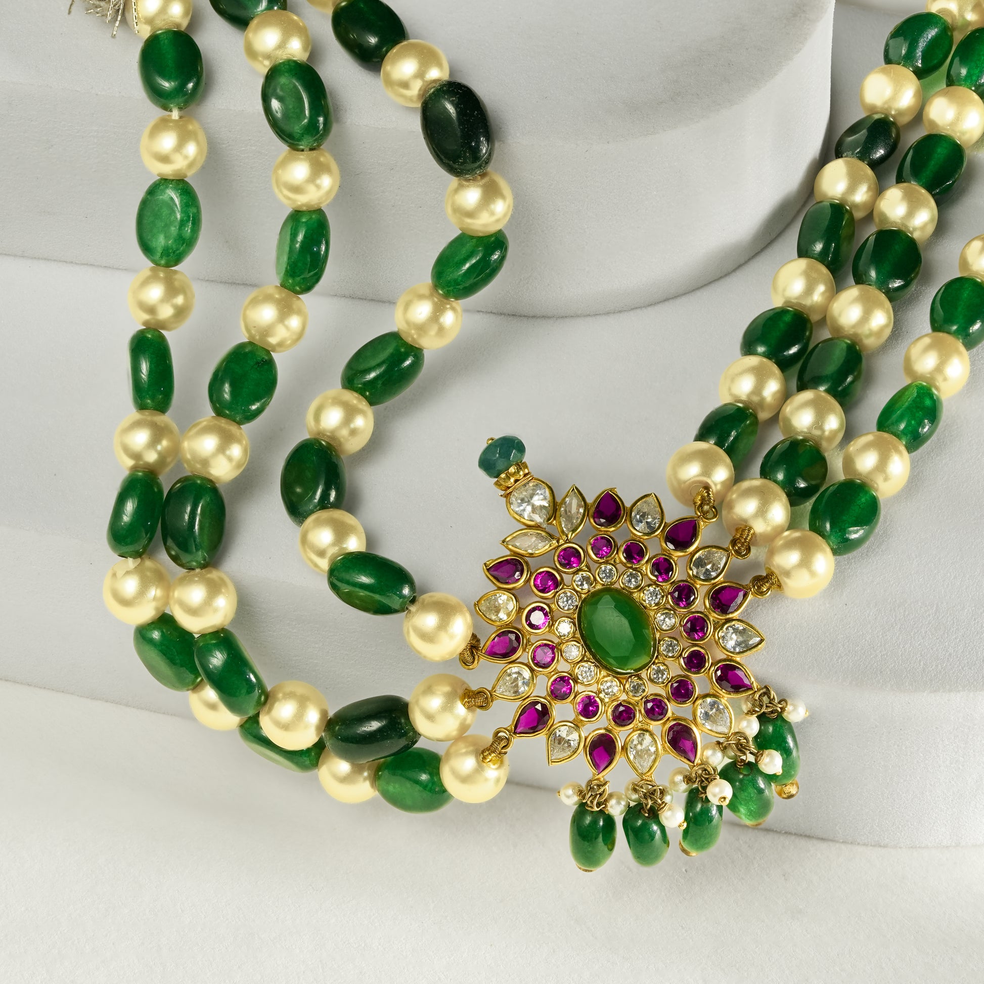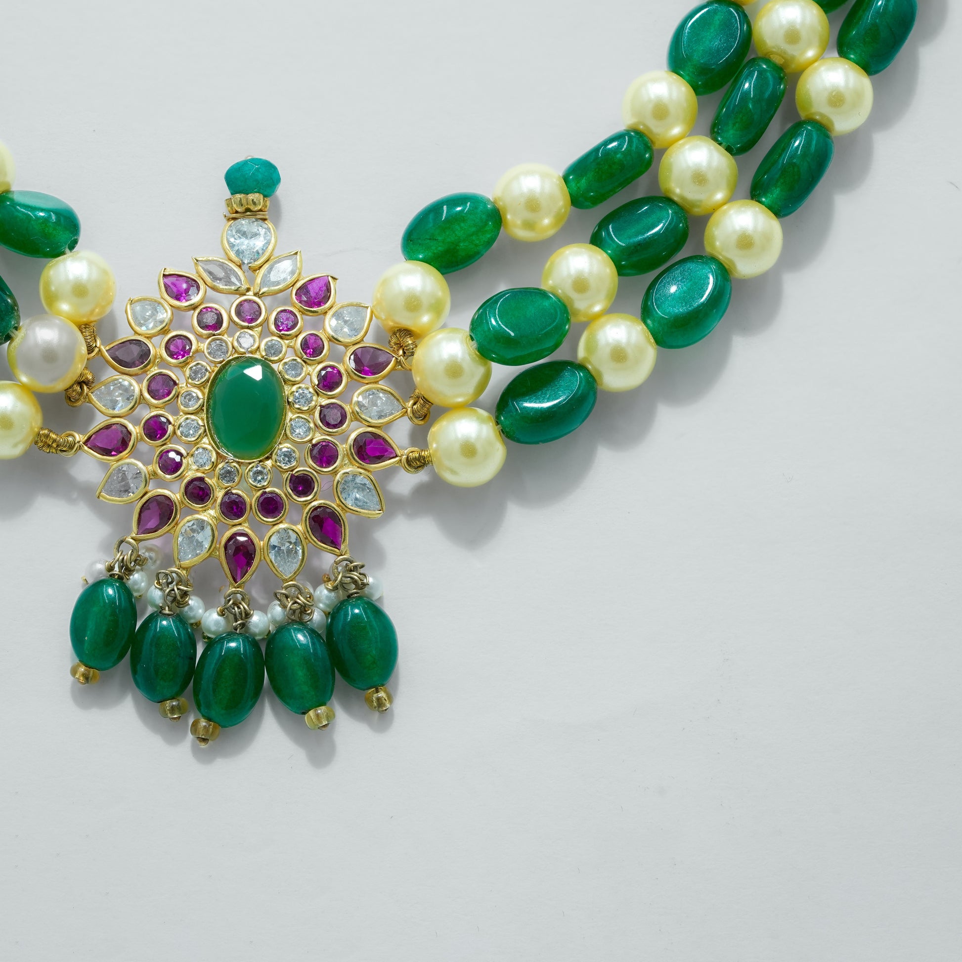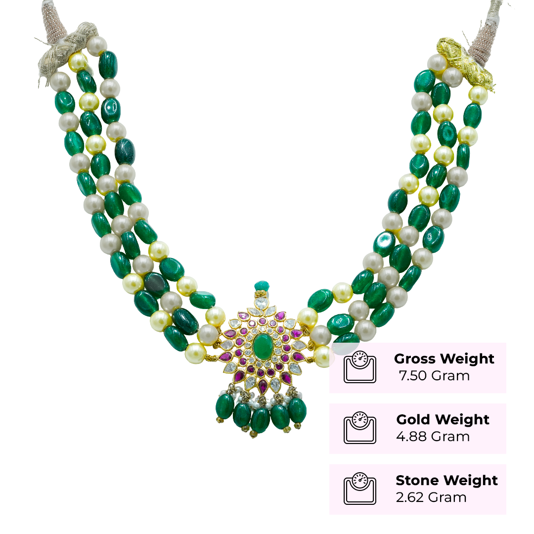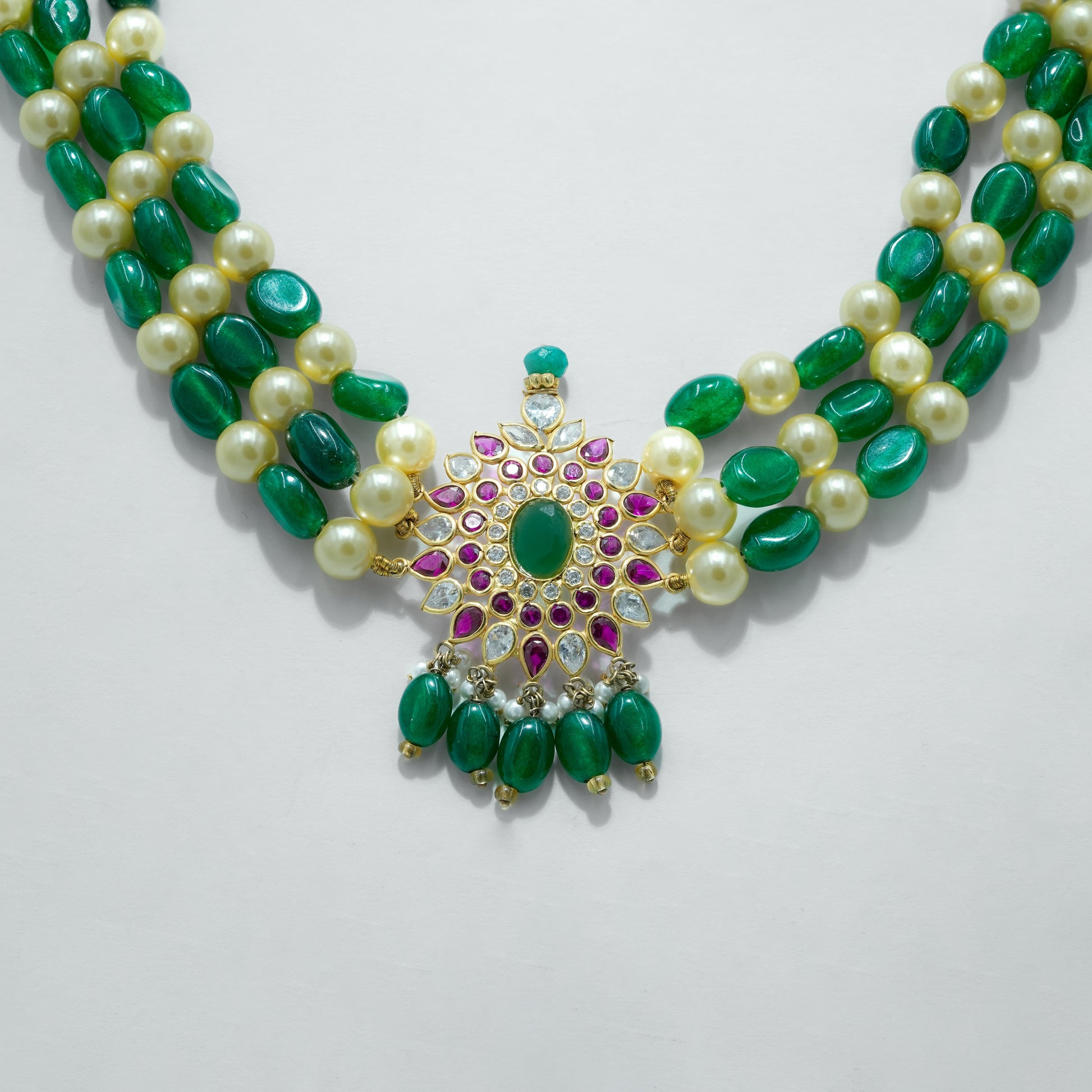 This handcrafted necklace features multiple strands of rich green emerald beads paired with soft white pearls, creating a balanced and refined contrast. At the center, a detailed floral pendant is adorned with emerald-toned stones and accent highlights, finished with delicate bead drops for graceful movement. Designed with a traditional gold-toned setting, this piece reflects skilled craftsmanship and cultural artistry.