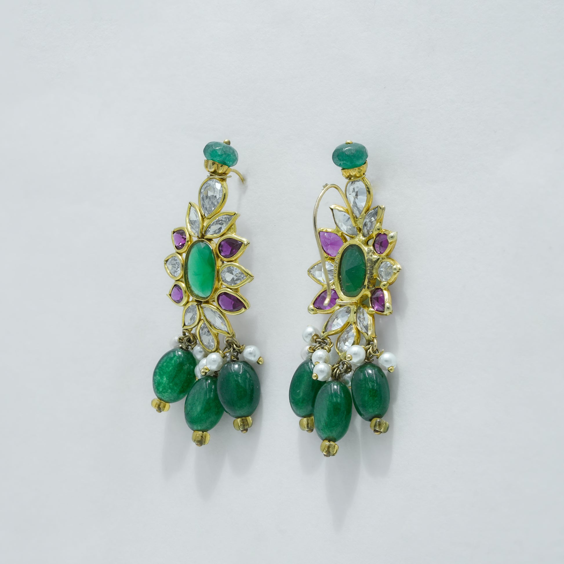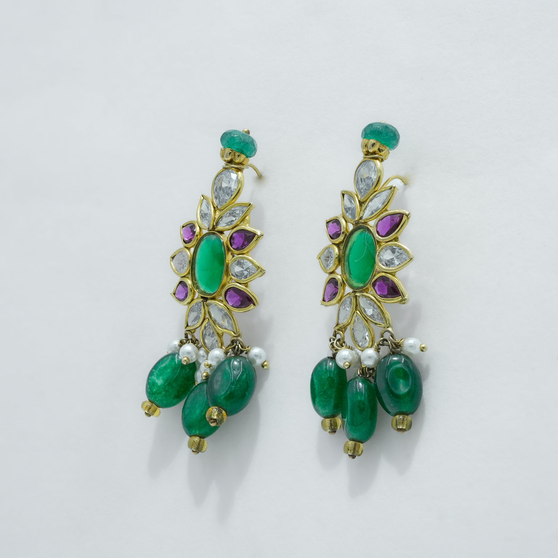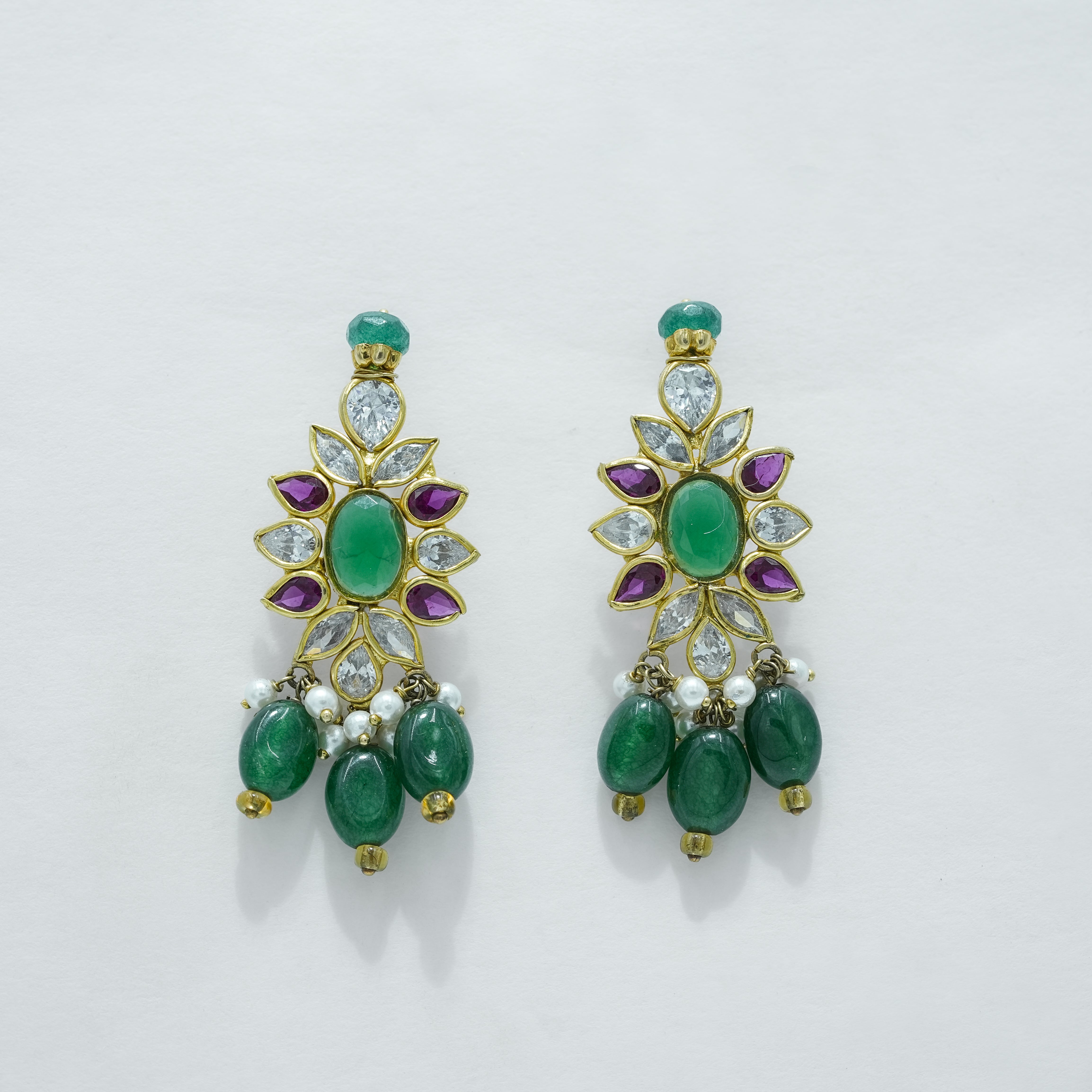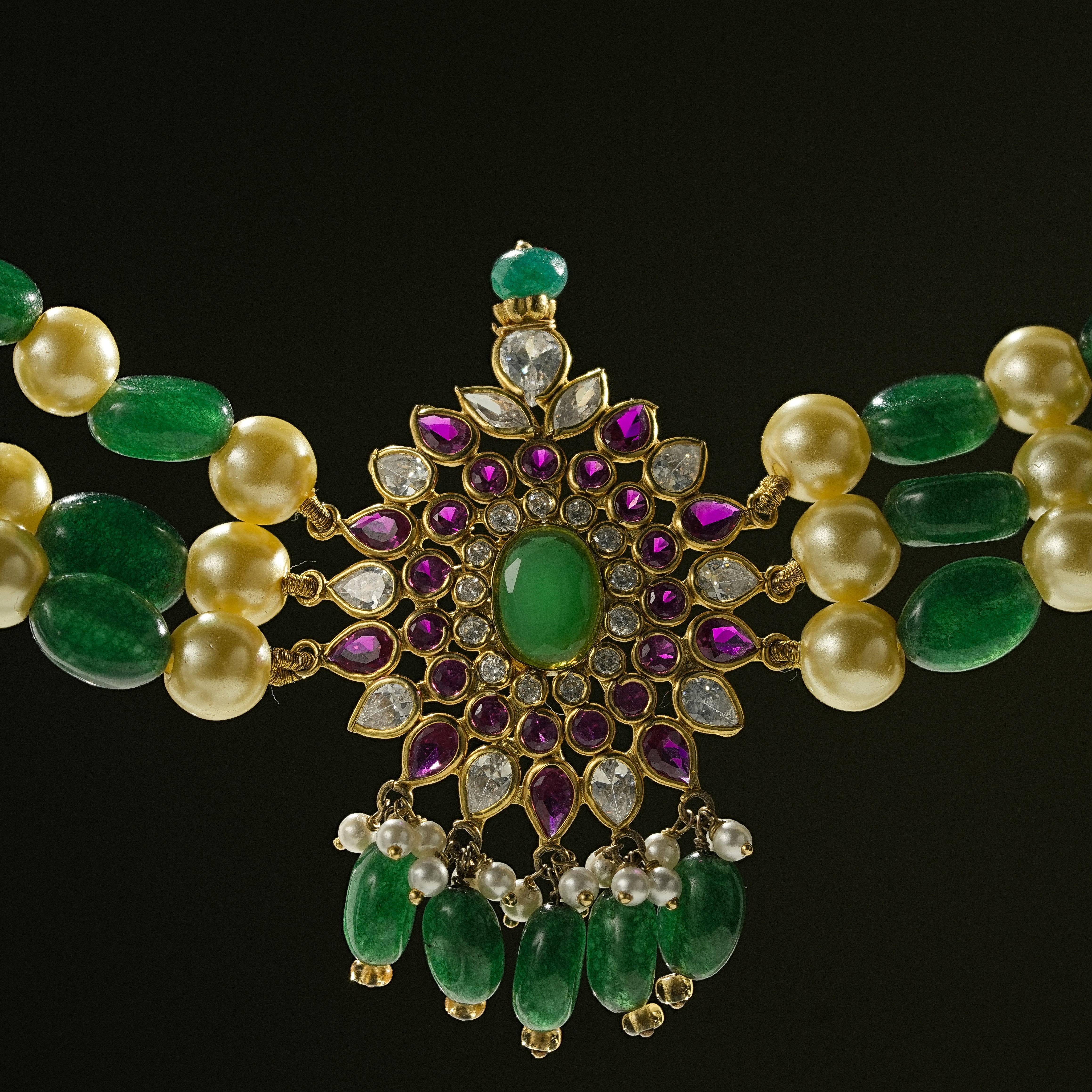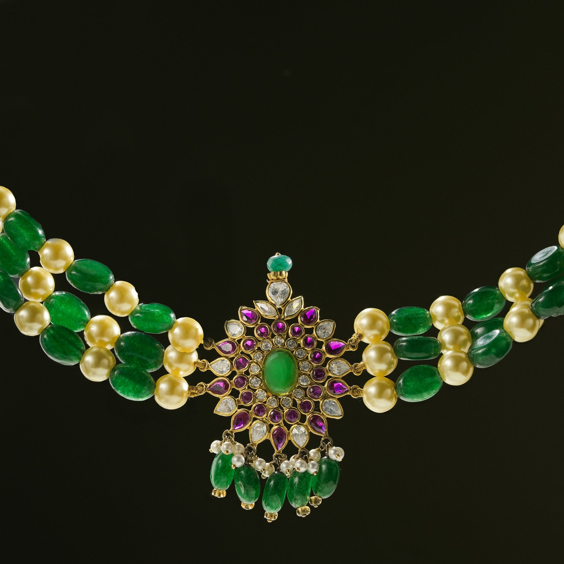 This handcrafted necklace features multiple strands of rich green emerald beads paired with soft white pearls, creating a balanced and refined contrast. At the center, a detailed floral pendant is adorned with emerald-toned stones and accent highlights, finished with delicate bead drops for graceful movement. Designed with a traditional gold-toned setting, this piece reflects skilled craftsmanship and cultural artistry.