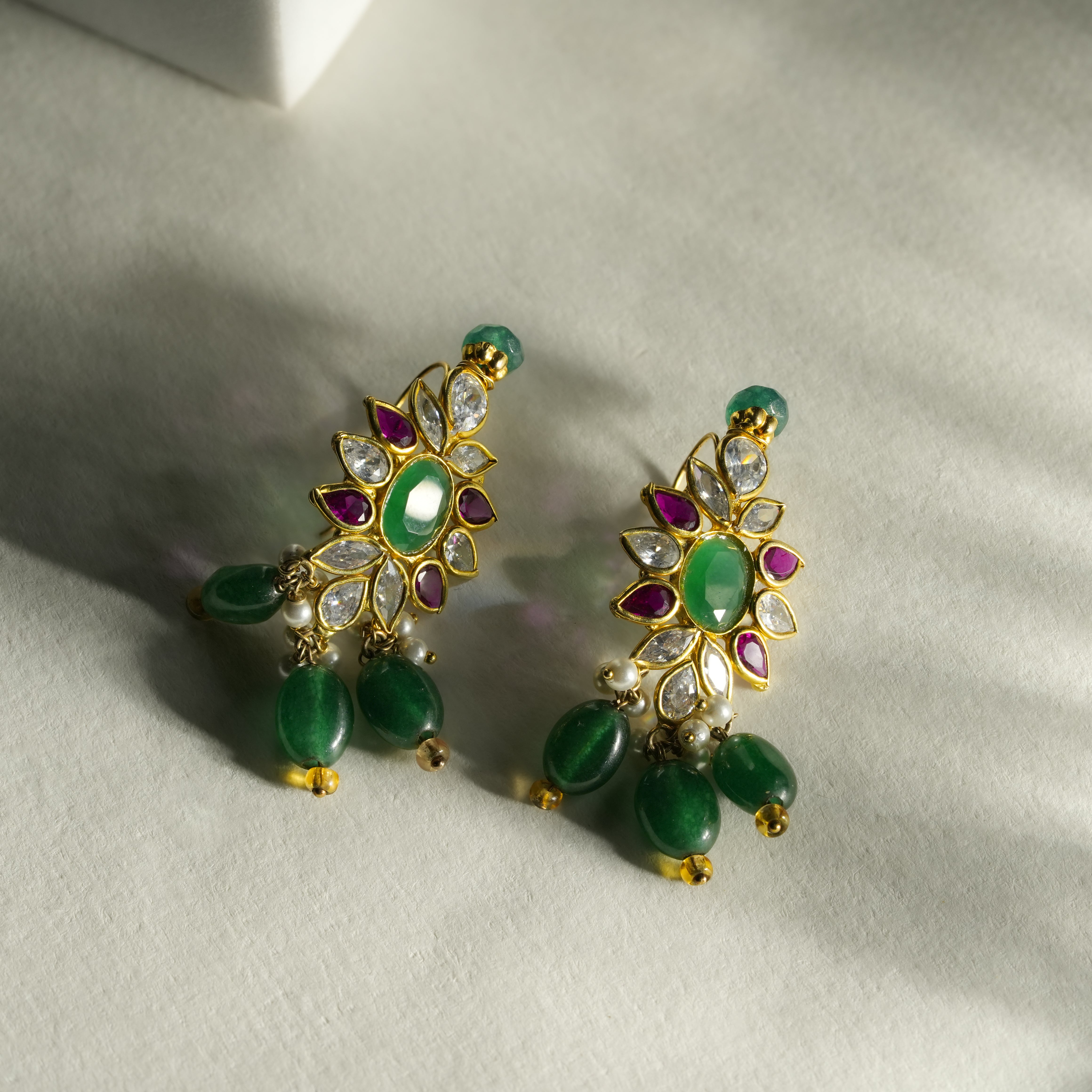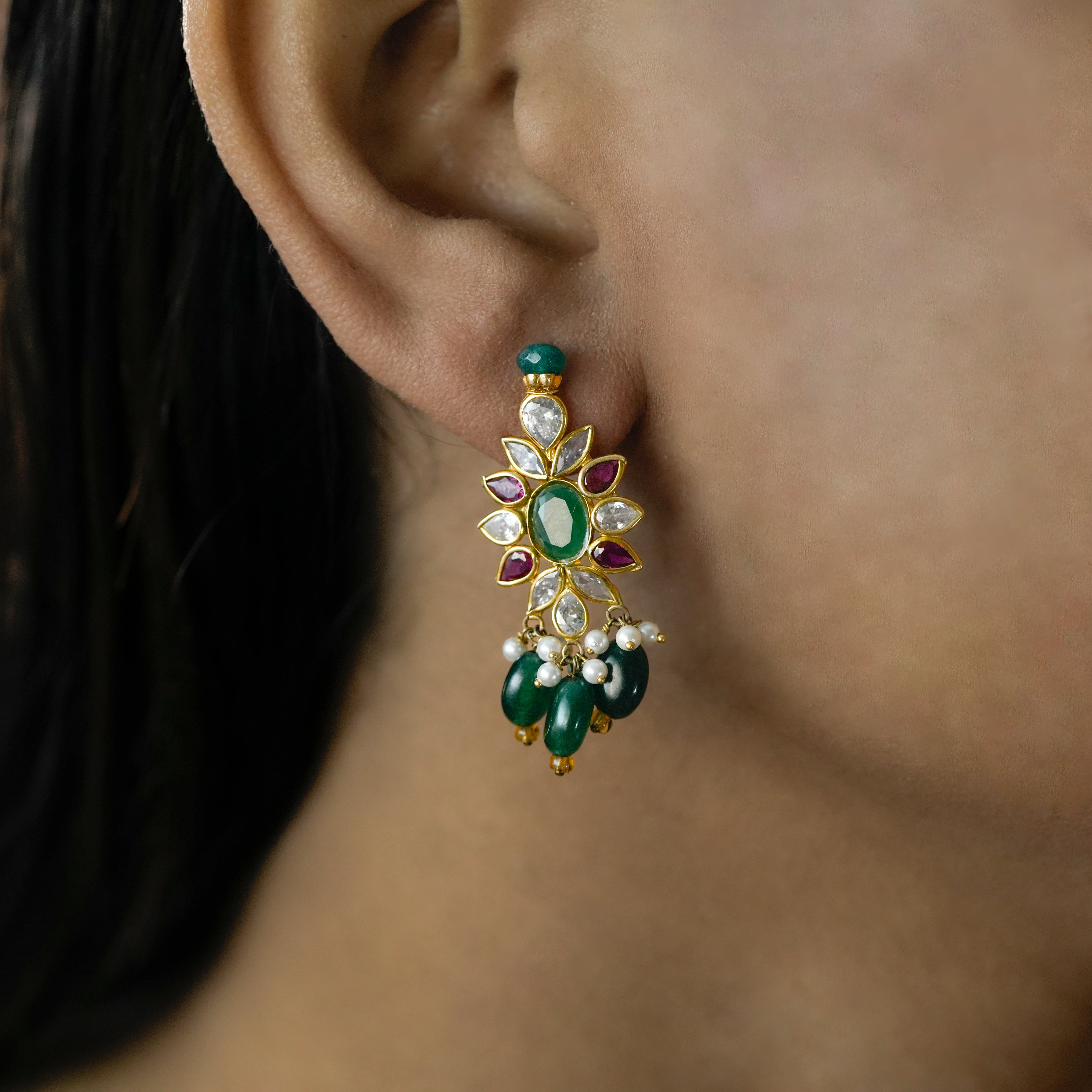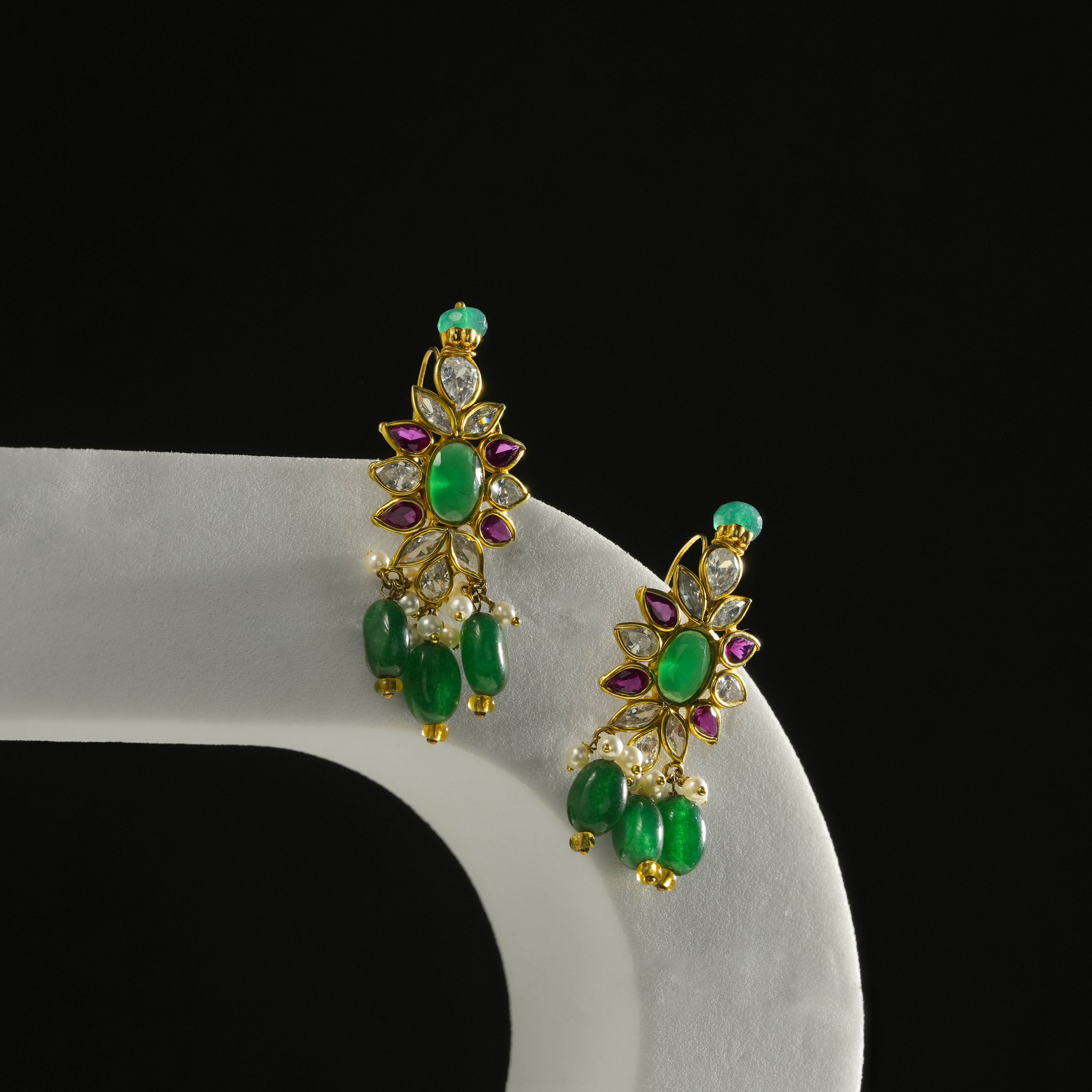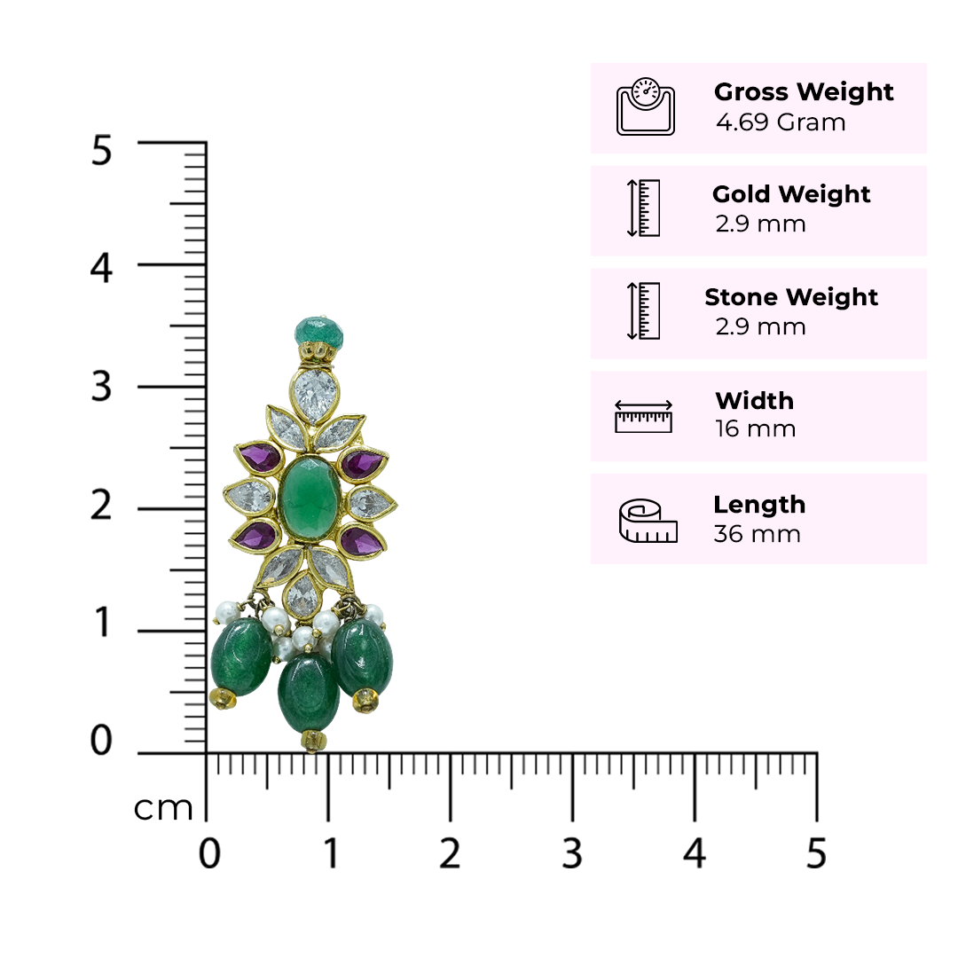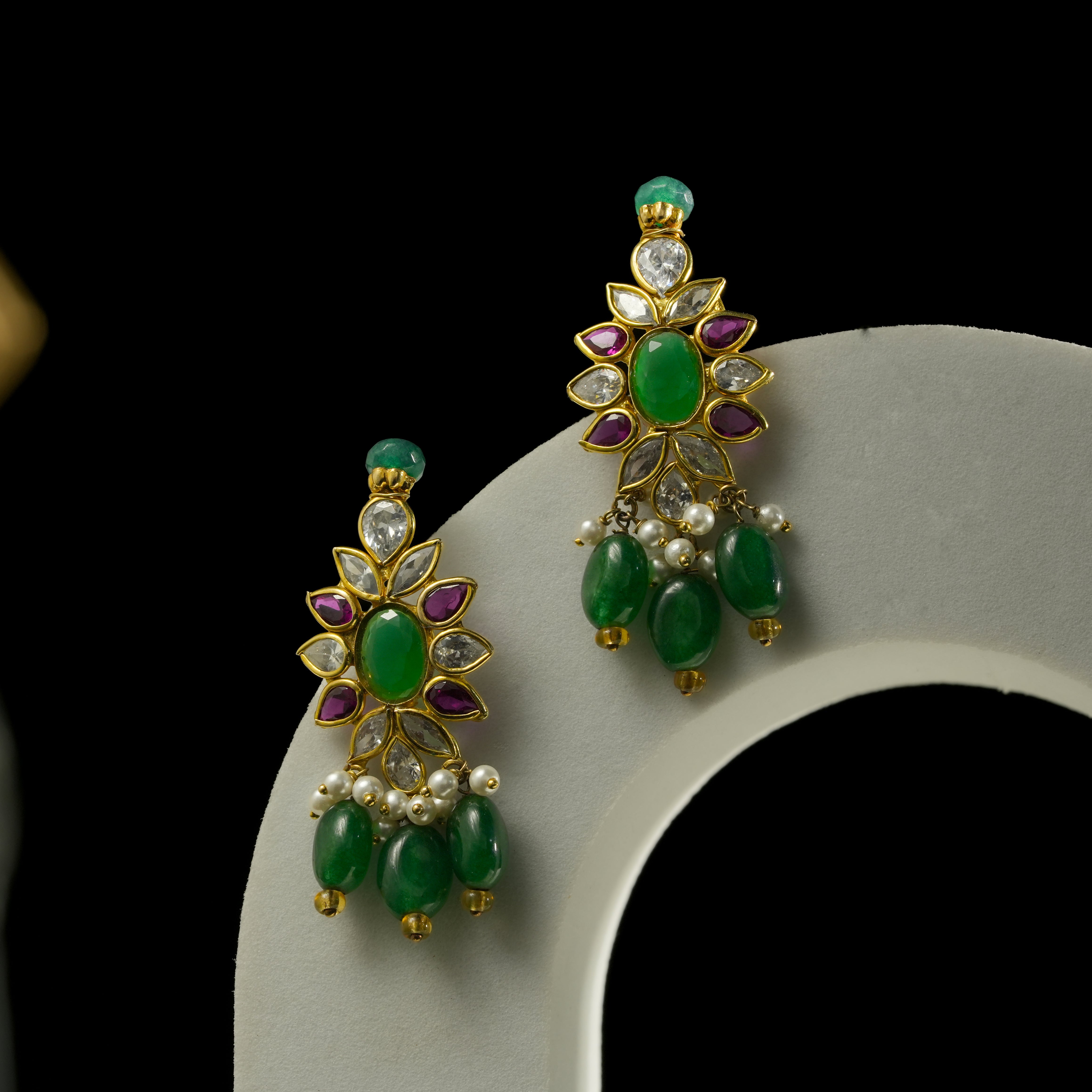 This handcrafted necklace features multiple strands of rich green emerald beads paired with soft white pearls, creating a balanced and refined contrast. At the center, a detailed floral pendant is adorned with emerald-toned stones and accent highlights, finished with delicate bead drops for graceful movement. Designed with a traditional gold-toned setting, this piece reflects skilled craftsmanship and cultural artistry.