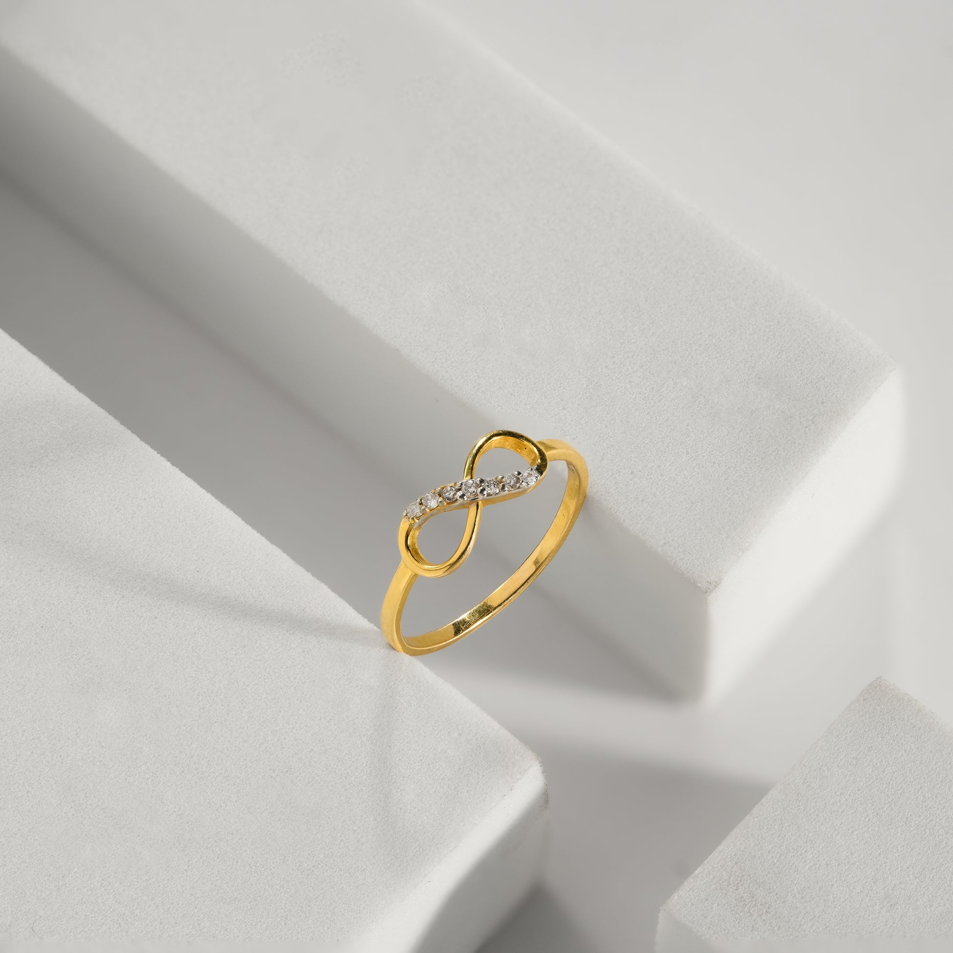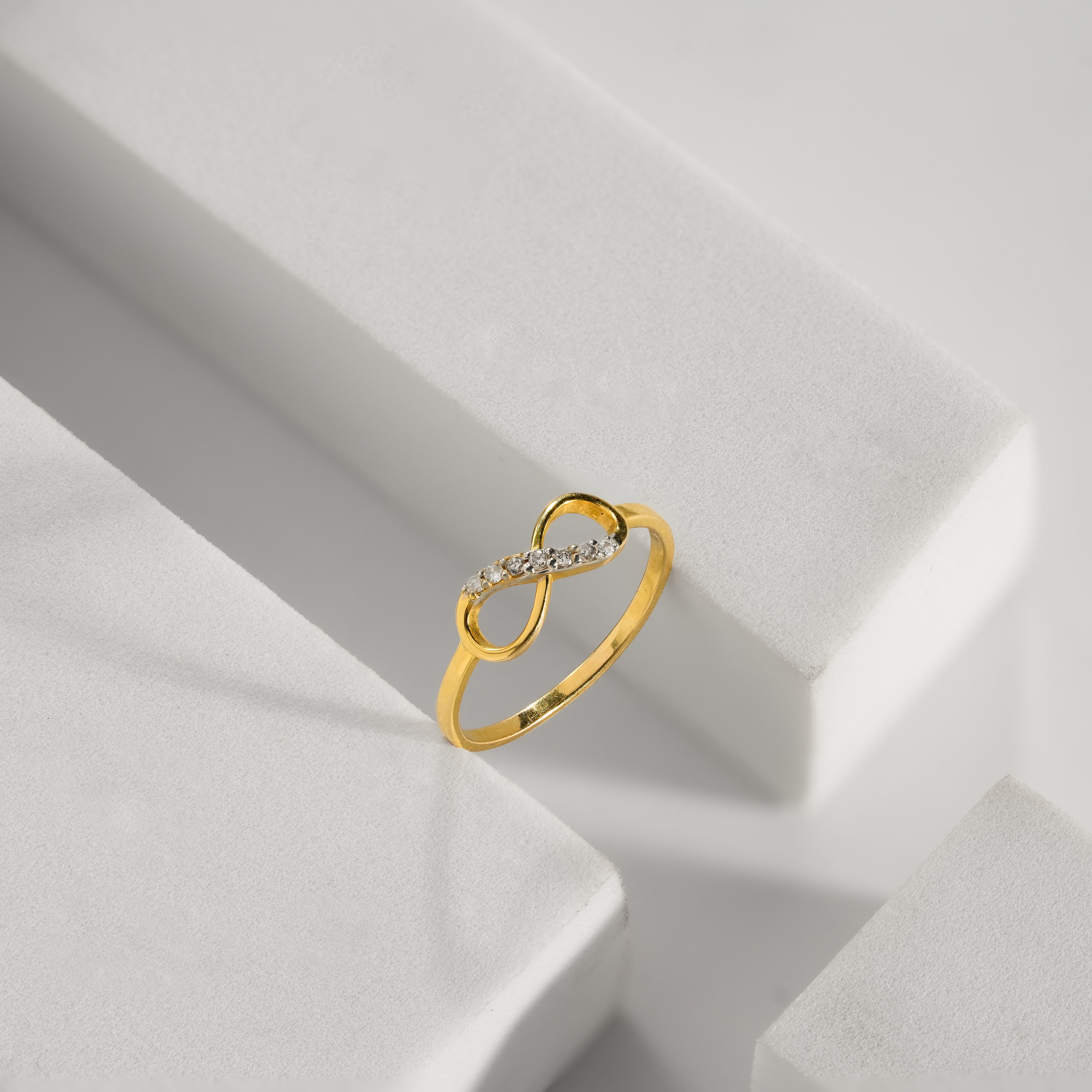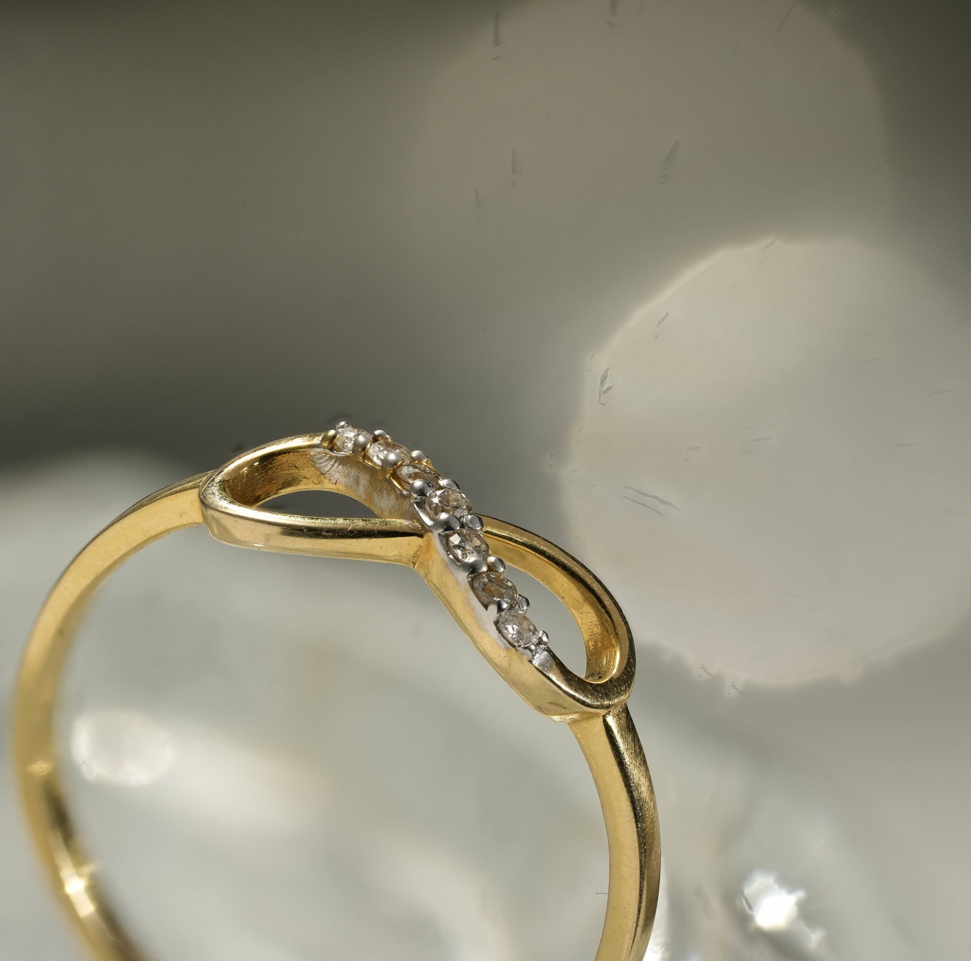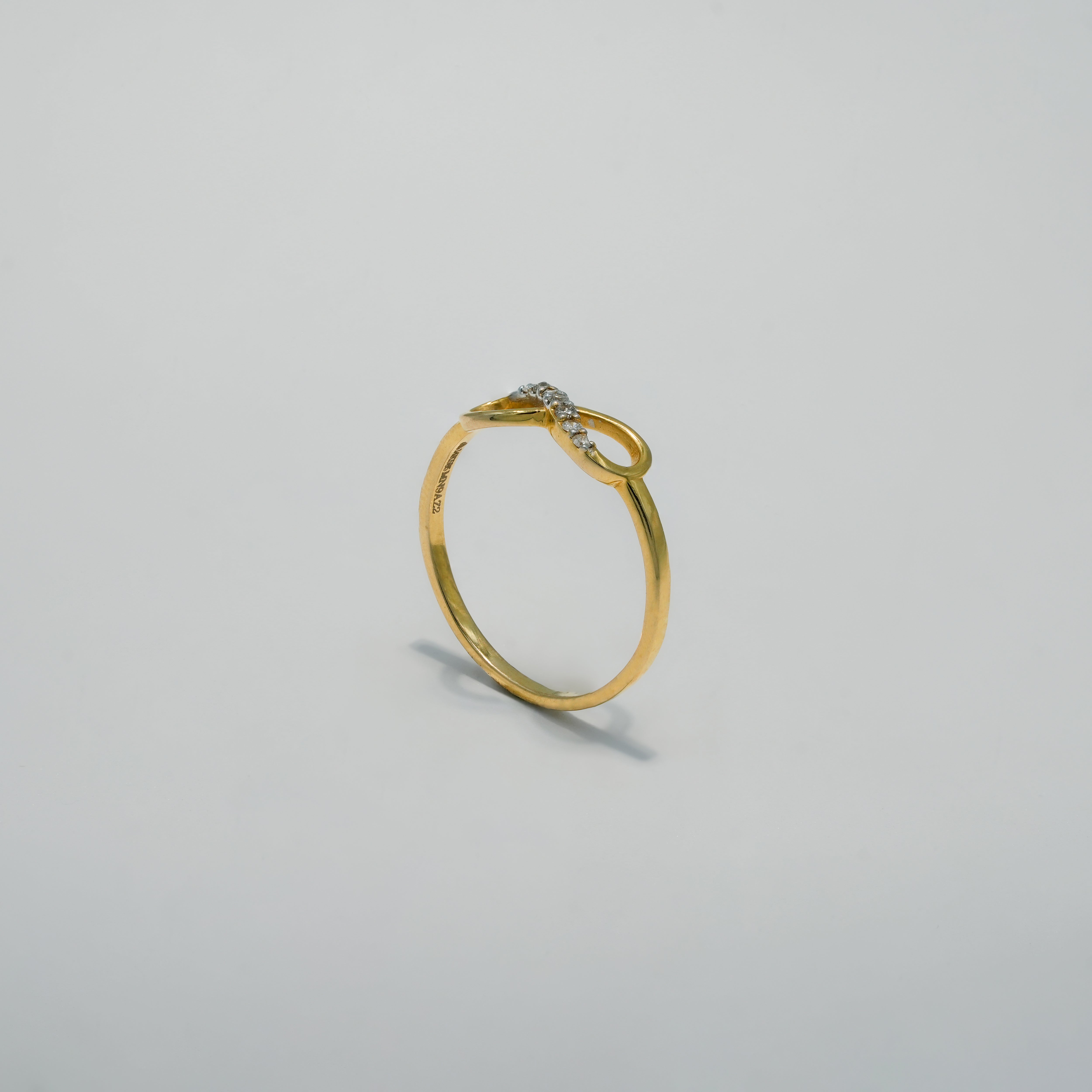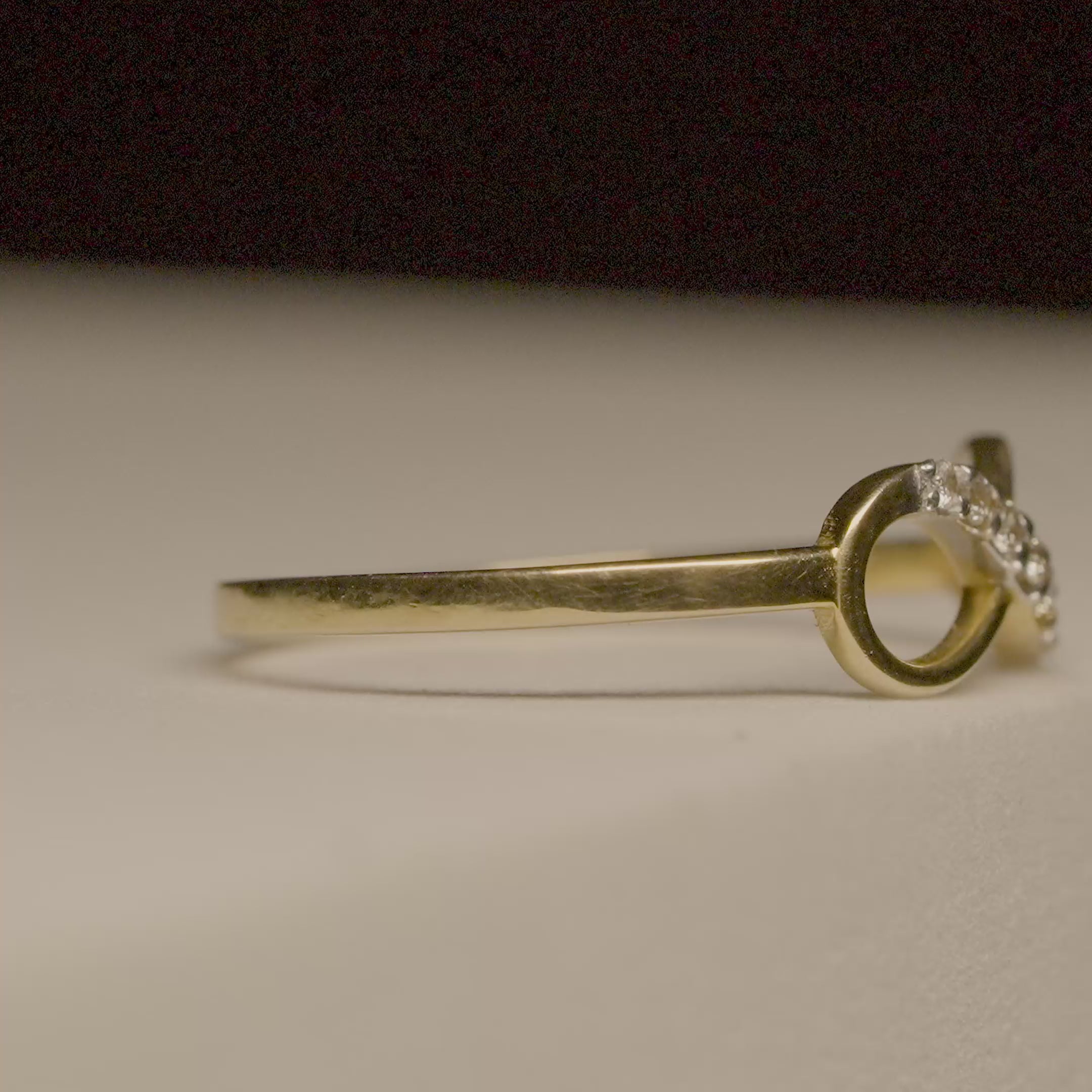 This graceful gold ring features a flowing infinity-inspired silhouette, symbolizing continuity and enduring connection. One side of the elegant curve is highlighted with a row of sparkling diamond accents, adding refined brilliance without overpowering the design. The slender gold band offers a comfortable fit and a clean profile, making it ideal for everyday wear or subtle occasion styling. Sophisticated yet understated, this ring is a timeless expression of modern elegance and thoughtful craftsmanship.
