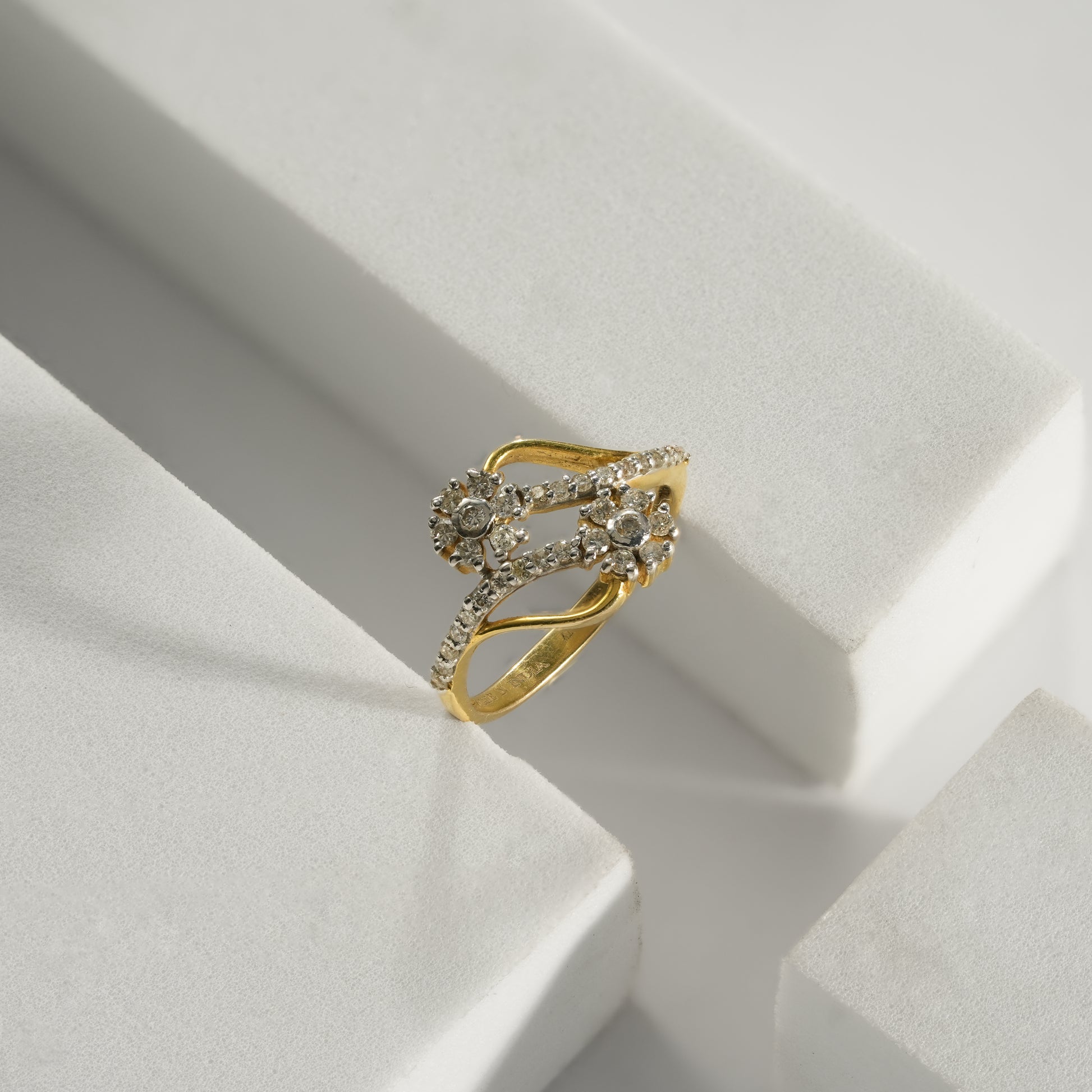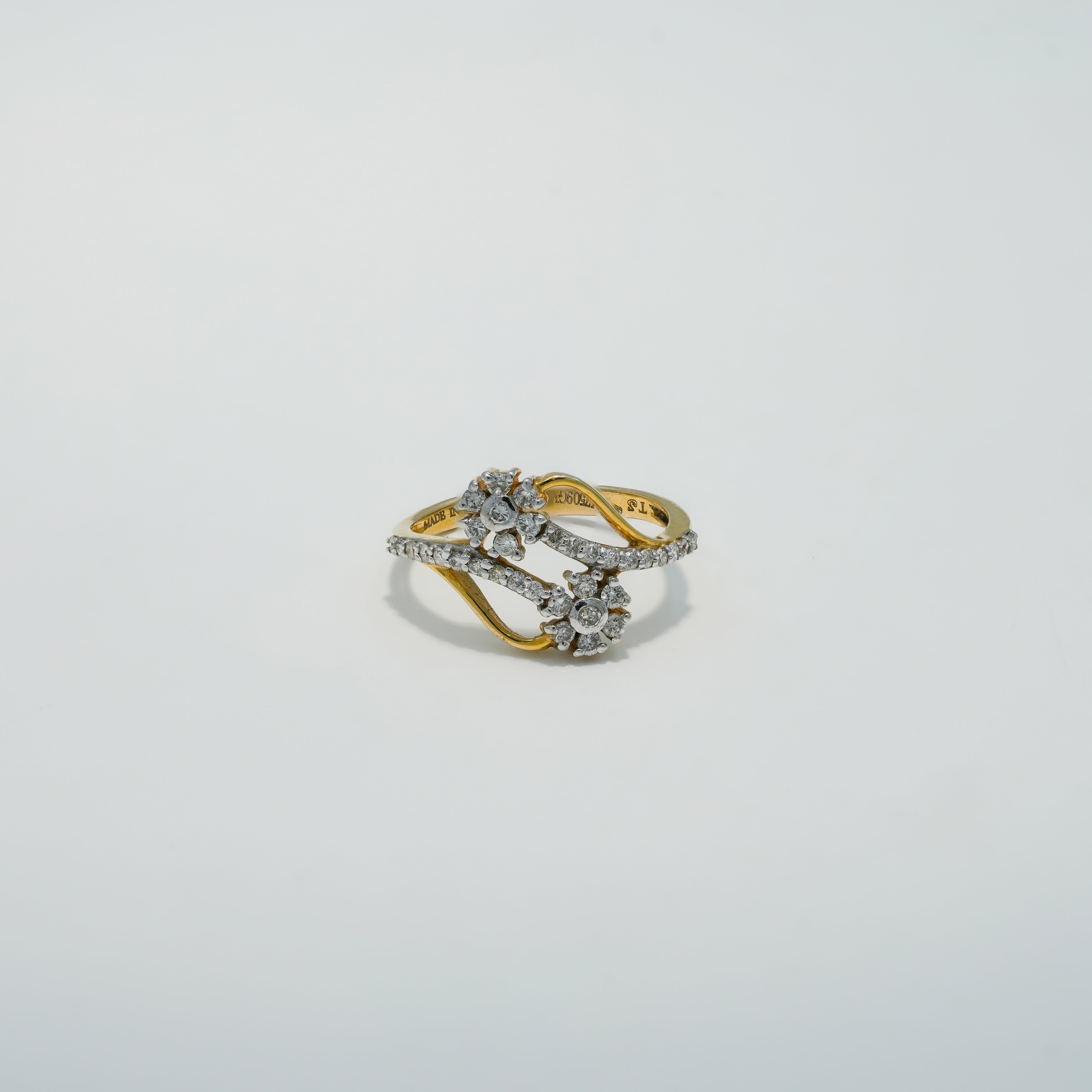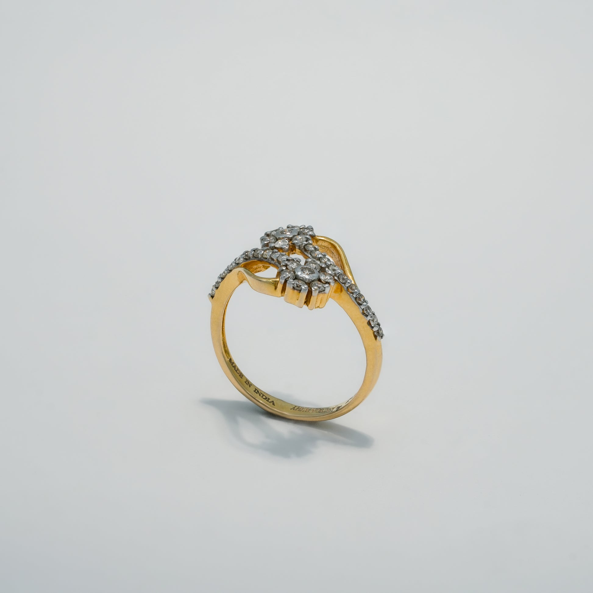 This sophisticated gold ring features an elegant interlaced design, highlighted by a graceful cluster of natural diamonds. The overlapping diamond-set curves create depth, movement, and a refined sparkle from every angle. Crafted to balance modern styling with timeless appeal, the ring offers a luxurious yet wearable profile. Ideal for special occasions or as a statement everyday piece, it reflects fine craftsmanship, thoughtful detailing, and enduring brilliance.