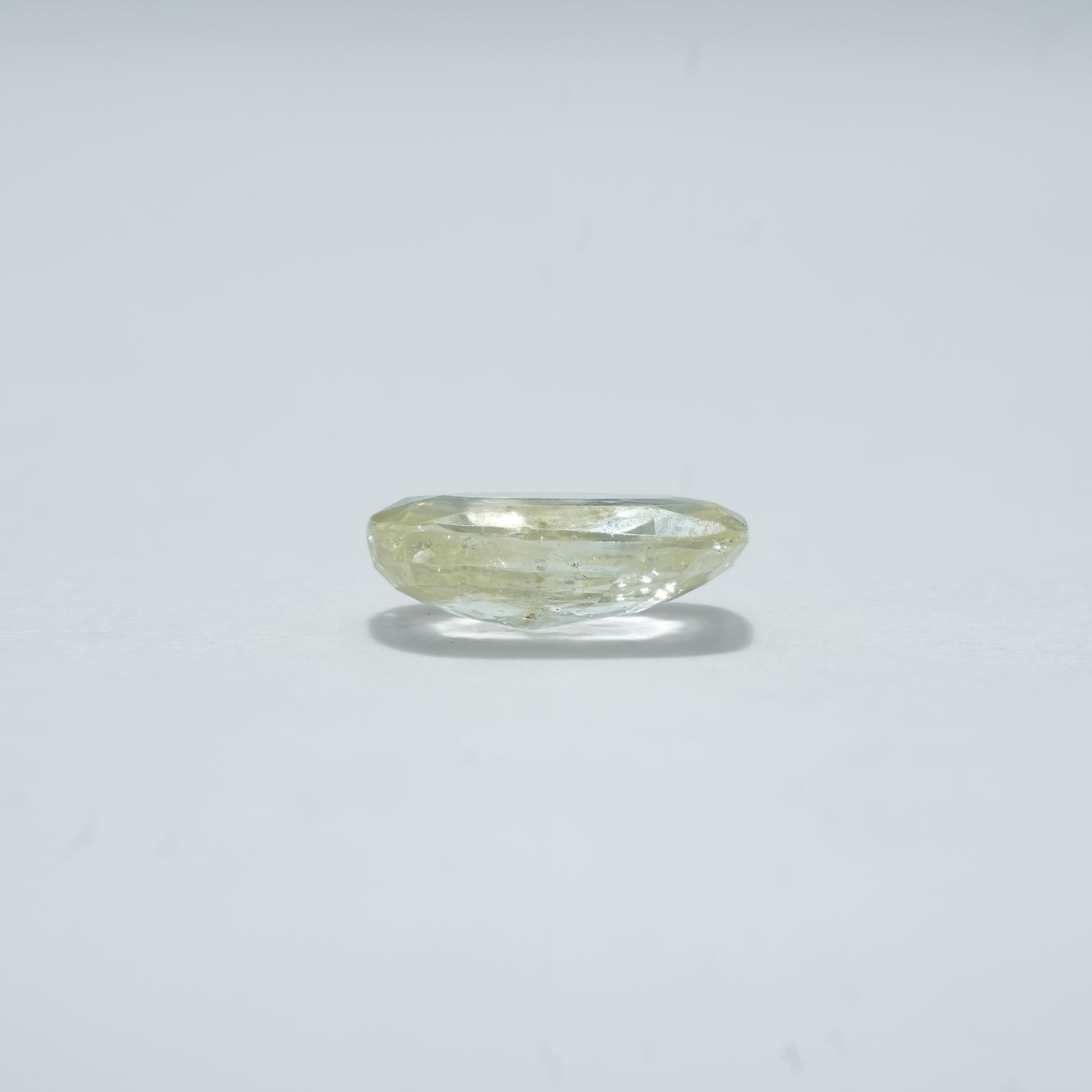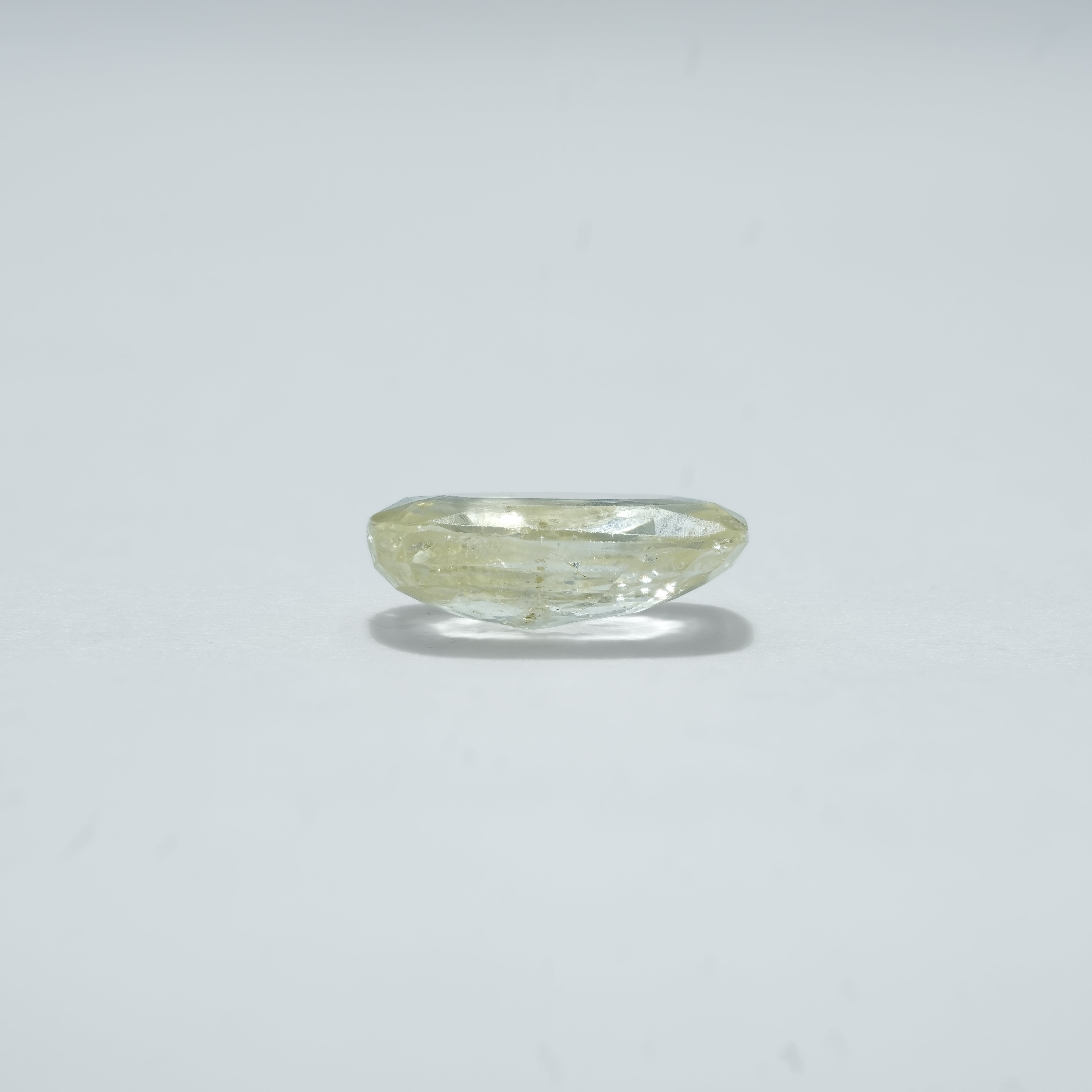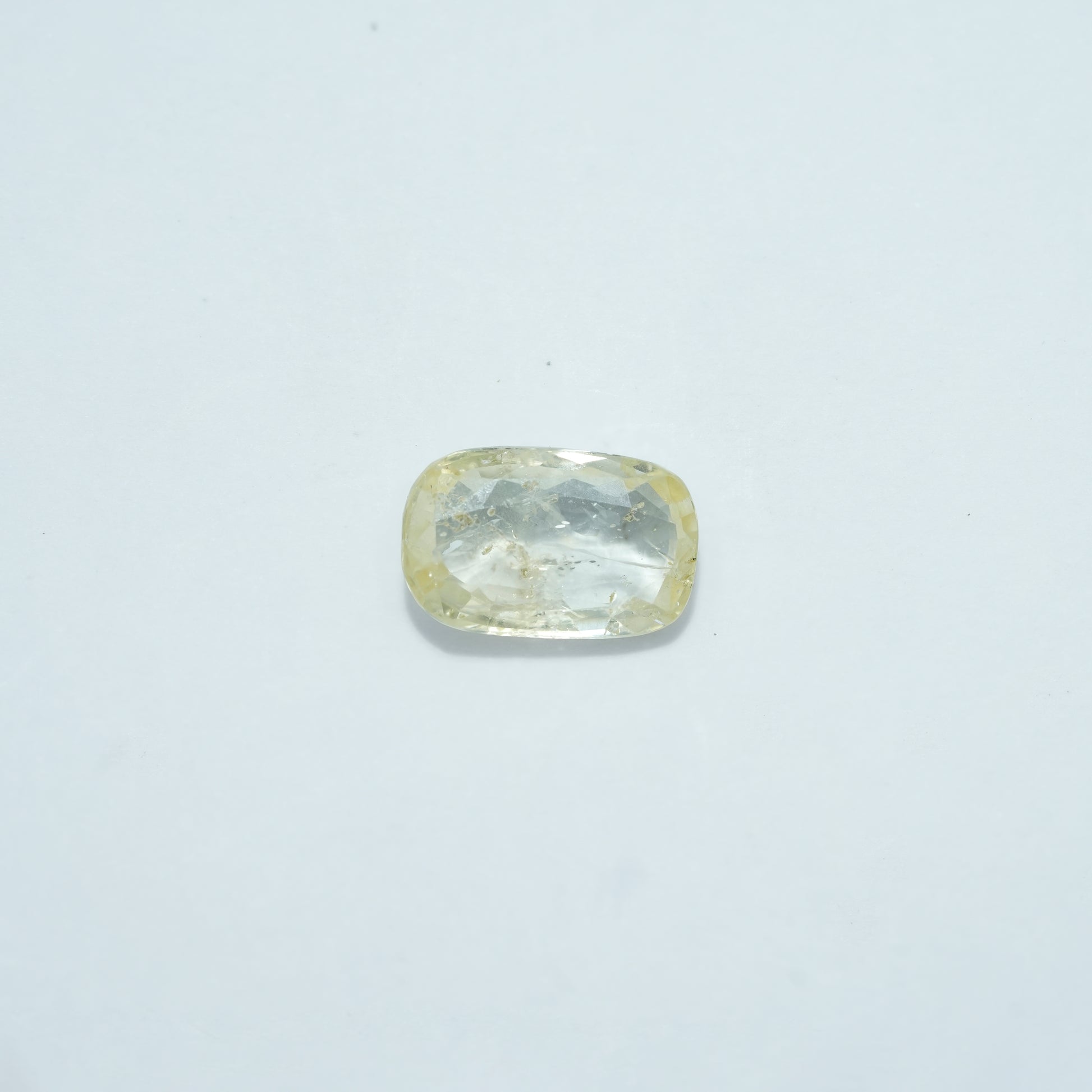 Natural 8.25 C Yellow Sapphire 9.17 Ratti Pukhraj gemstone displays a soft yellow hue with subtle tonal variations, enhanced by a cushion mixed cut that maximizes light reflection.