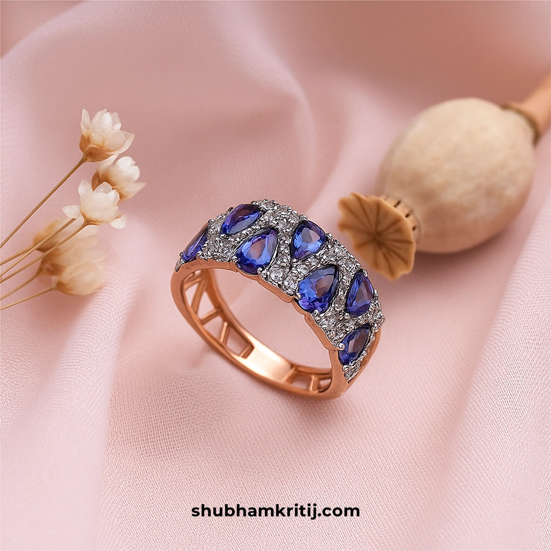 The Royal Blue Sapphire Band Ring is a symbol of timeless sophistication and elegance. Crafted in rose gold, it showcases a graceful row of pear-shaped blue sapphires, each framed by sparkling diamonds that enhance their deep hue. The openwork band design ensures comfort while adding a modern aesthetic. Perfect for special occasions or daily wear, this ring brings together brilliance and luxury in perfect harmony. A must-have for every woman who loves refined beauty.